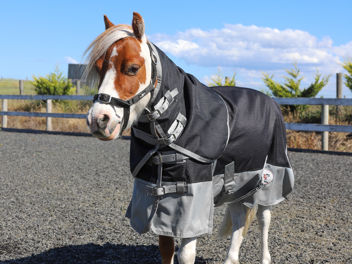Our new waterproof and durable, synthetic winter black and grey detach-a-neck rug protects your miniature horse or pony from the elements this winter.